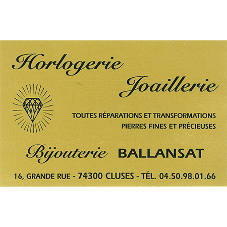 La bijouterie Ballansat, historique et située depuis 70 ans dans la grande rue commerçante de Cluses, a été reprise par Michel Ballansat en 1998. Attachée à satisfaire ses clients par l’accueil, le choix et le service après-vente, elle a su fidéliser sa clientèle au fil des ans. Située au 16 grande rue, près de la Mairie, elle propose un large choix de bijoux originaux et de montres classiques ou connectées. Elle propose aussi des bijoux personnalisés avec service de gravure. La bijouterie assure la réparation de bijoux, réveils, montres et changement de piles.